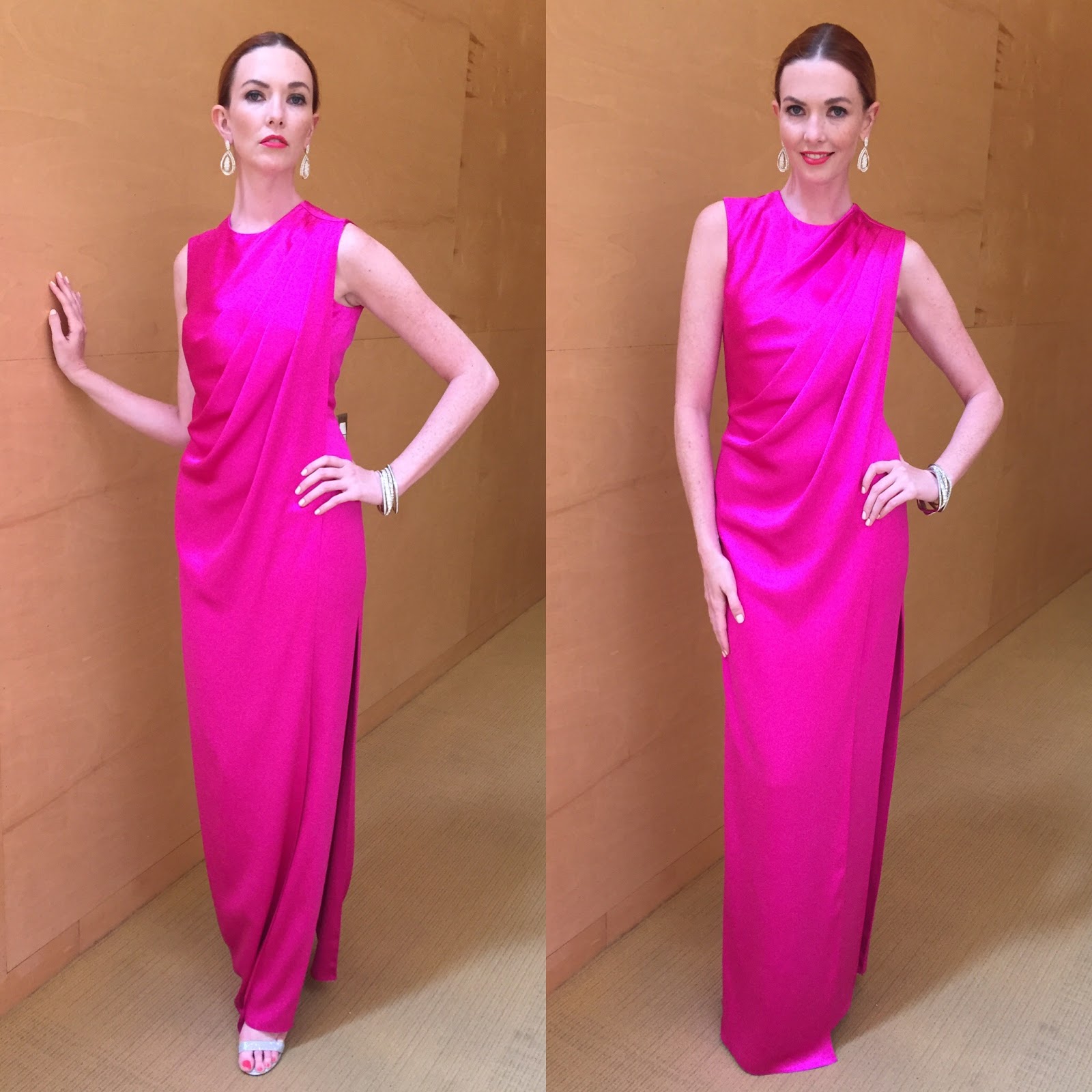 Model Amanda Fields Bennett in NIKOLAKI/Nick Verreos & David Paul Resort 2017 fuchsia pink Crepe-back Silk Satin Side Draped "Sari" Column Gown